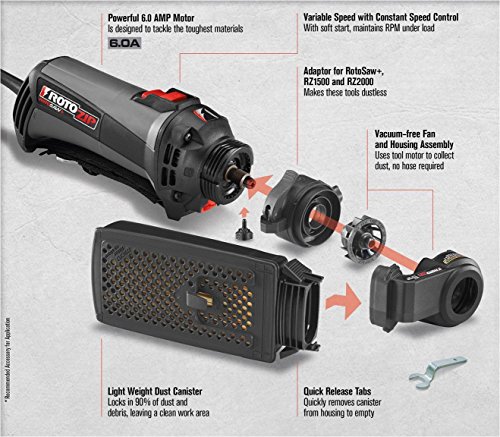- Lightweight canister quickly and easily attaches to RotoZip Spiral Saws maintaining visibility while cutting