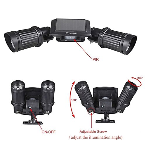 Rowrun ledソーラーライト 人感センサー付き 360°度回転 壁掛け式 太陽発電 14LED 2灯式 屋外照明 軒先 庭先 駐車場 ガーデン 玄関周りなど対応 夜間自動点灯 IP65防水 防犯用 外灯 省エネ 昼白色