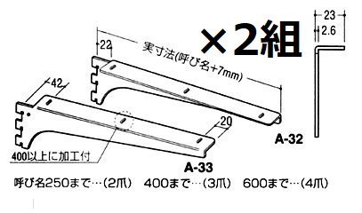 - A-32(向かって右)、A-33(向かって左)の左右2本の木棚受アームが1セットとなっています。