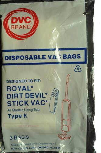 Works With: Royal Dirt Devil Type K Royal Dirt Devil Stick Vac Royal Dirt Devil Stick Vac 3320230001 Dirt Devil 3-320235-001 Description:DVC Generic Replacement Brand, 3 Bags In Pack