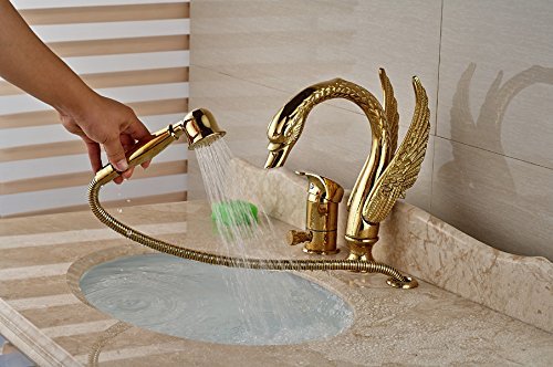 Rozinsanitary Bathtub&Basin Faucet w/ Hand Sprayer Gold Plate Luxury Swan Style Shower Tub Mixer Tap Deck Mount One Handle