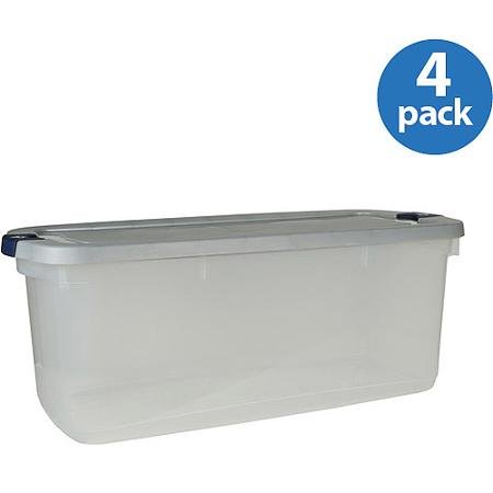 Made with a super touch, plastic material;Includes 4 clear bases and 4 gray lids with blue latches;95-quarts each;Product in Inches (L x W x H): 36.0 x 15.0 x 14.0;Primary Color: Clear
