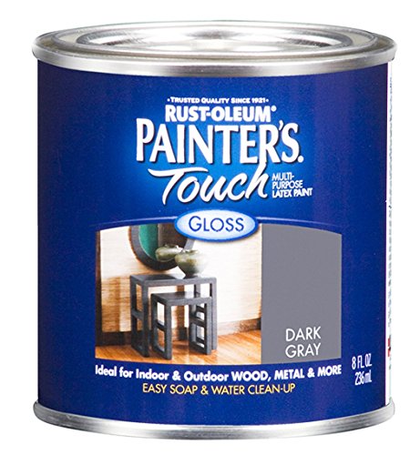Fast-drying. Latex paint. Ideal for indoor and outdoor wood, metal and more. Easy soap and water clean up. Gloss. Dark Gray. Half pint. Length: 3.1. Width: 2.86. Height: 2.86