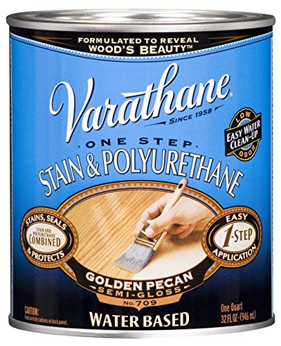 Soap and water clean-up. "VARATHANE" WATERBASED STAIN & POLYURETHANE Varathane One Step Stain & Polyurethane - Water Based adds rich color and a smooth protective finish. Apply to wood furniture, trim, cabinets, doors and more (do not apply to floors). Finishes projects faster and more conveniently by combining two steps and allowing soap-and-water cleaning. Highlights: Indoor use only Deep, rich color Stain and Polyurethane combined into one step Soap and water clean up. Golden Pecan Finish Quart