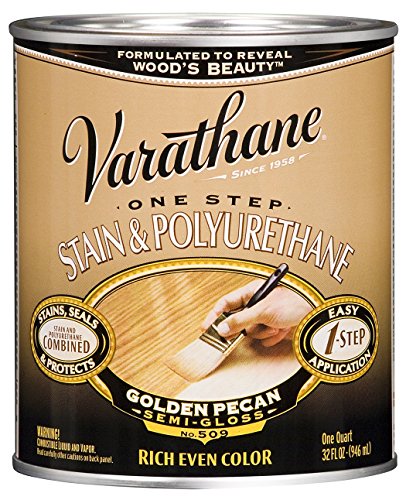 Soap and water clean-up. Rust-Oleum 225243 One Step Stain & Polyurethane, Golden PecanVarathane One Step Stain & Polyurethane allows you to apply both a stain and a polyurethane in one easy step! The premium pigments provide deep, rich color and Varathane's renowned polyurethane adds a smooth, even protective finish without brush marks.Please read product labels for additional directions and precautions before usingRust-Oleum 225243 One Step Stain & Polyurethane, Golden Pecan Features: Combines Stain and Polyurethane into one step Deep, rich color Smooth, even protective finish Premium pigments provide deep rich color Semi-Gloss polyurethane adds a smooth even protective finish Does not leave brush marks Golden Pecan finish 1 quart
