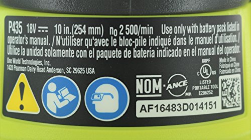 Battery and Charger Not Included. The RYOBI 18V ONE+TM 10 in. Orbital Buffer is a brand new addition to the RYOBI 18V ONE+TM System. This tool provides up to 2,500 RPMs for a swirl-free finish while offering the user cordless convenience. With a powerful motor, this buffer maintains optimum performance during extended use. The 18V ONE+TM 10 in. Orbital Buffer runs up to 90 consecutive minutes with the 18V ONE+TM LITHIUM+TM High Capacity Battery (P108 - sold separately). The RYOBI 18V ONE+TM 10 in. Orbital Buffer works with any 18V ONE+ battery and is a part of the ONE+TM System of over 50 great tools that all work with the same 18V battery platform. Includes: P435 Orbital Buffer, Elastic Applicator Bonnet, Elastic Buffing Bonnet, Operator's Manual Full-size 10 in. buffing applicator and bonnet completes job quickly Powerful motor maintains optimum performance during extended use Cordless convenience allows the option to operate buffer in remote locations Crescent-shaped handle provides comfort and access to hard-to-reach spaces Random orbital action delivers a swirl-free finish Elastic band keeps bonnet securely in place New and improved GRIPZONE overmold for optimum grip and user comfort Battery and charger sold separately
