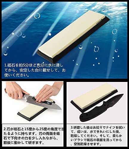 使用の説明: 1.砥石を水の中で5分間ぐらい浸して、水は砥石が乾かない程度の少量(数滴)をときどきかけてやれば結構です。平穏の所(.砥台)の上に置く、またブレードを摩擦する、十分な鋭い刃まで 。 *一般的には、鋭いな刃物を維持するために、週に一回研ぎなださい 2.使用後、まずはお絞りで砥石を拭いてください、次に、水できれいに洗ってから、干してください、最後に、柔らかいブラシで砥石の表面を洗う、そして干してください *ご注意下さい: 1.砥石を保護するために、砥石が高さから落下しないでください 2.刀と砥石などは子供が触れられない場所に置いてください