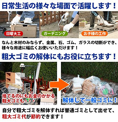 - 多機能:この商品ひとつで、木材・ガラス瓶・プラスチック・軟鉄・アルミ・ゴム・合板(集成材)など、一般家庭にありふれた様々なモノをカットできる万能セットです。