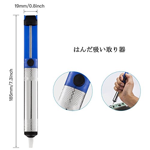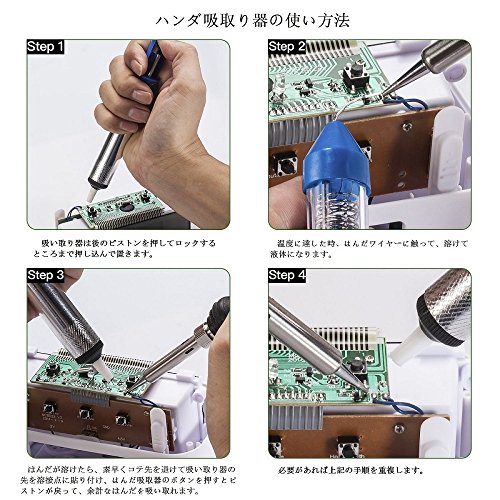 - 【高効率的に放熱】-スチールパイプが迅速に冷却でき、コテ先にある四つの通気穴が効率的に放熱します。また、改良された電路基板はチップ固定抵抗器を搭載し、放熱にも役立ちます。ハンダ吸い取り器はジュラルミンを使用して、内部に高圧縮比の優れたスプリングが負圧力が出でいて、PCBに溶解したはんだを取るできて、片手の操作に最適です。