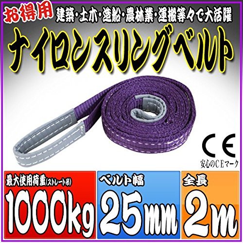 - 全長:2m ベルト幅:25mm 最大使用荷重(能力) ・ストレート吊り:1000kg ・チョーク吊り:800kg ・バスケット吊り:2000kg