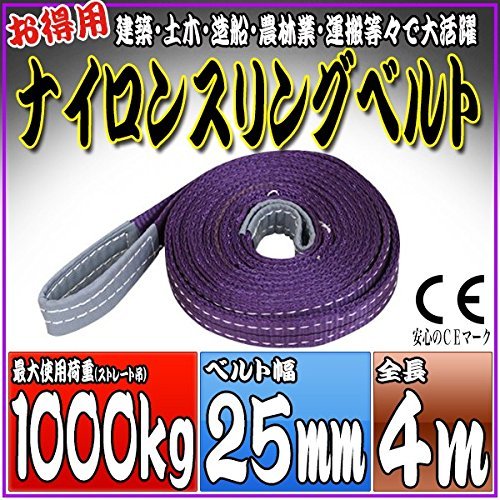 - 全長:4m ベルト幅:25mm 最大使用荷重(能力) ・ストレート吊り:1000kg ・チョーク吊り:800kg ・バスケット吊り:2000kg