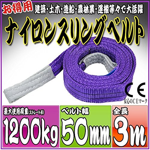 - 全長:3m ベルト幅:50mm 最大使用荷重(能力) ・ストレート吊り:1200kg ・チョーク吊り:960kg ・バスケット吊り:2400kg 材質:ポリエステル100% 両端アイ型 CE規格品
