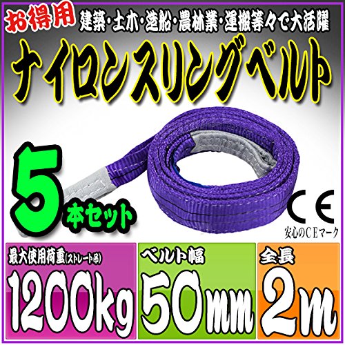 スリングベルト 5本セット 2m 幅50mm 使用荷重1200kg ナイロンスリング 吊上げ 牽引