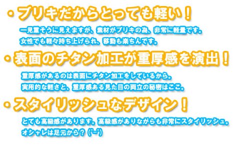ブリキなのでとっても軽く表面のチタン加工が重量感を演出し、なんといっても高級感があるのでお部屋をより一層、素敵な空間になること間違いなし。