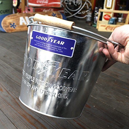 ピカピカのブリキ製バケツにGOOD YEAR(グッドイヤー)のロゴがエンボスにデザインされたバケツです♪