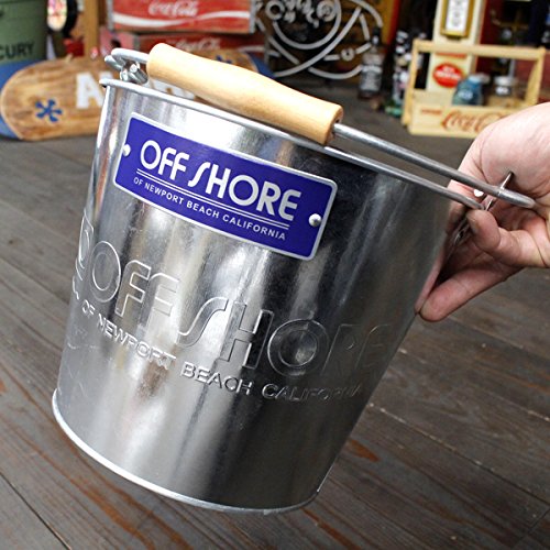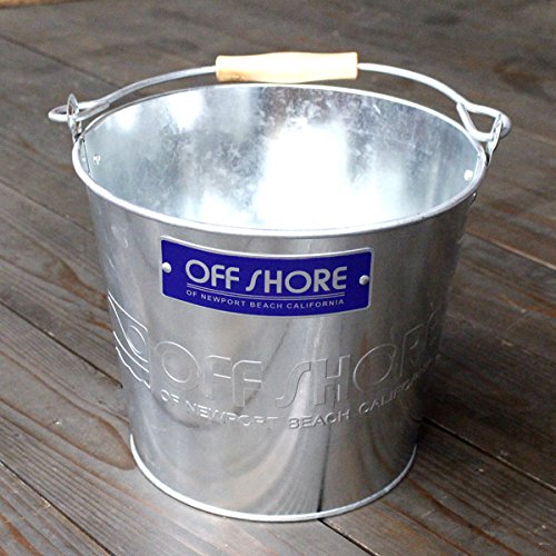 ピカピカのブリキ製バケツにOFF SHORE(オフショア)のロゴがエンボスにデザインされたバケツです♪