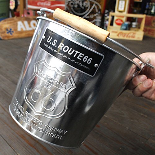 ピカピカのブリキ製バケツにルート66のロードサインがエンボスにデザインされたバケツです♪