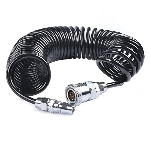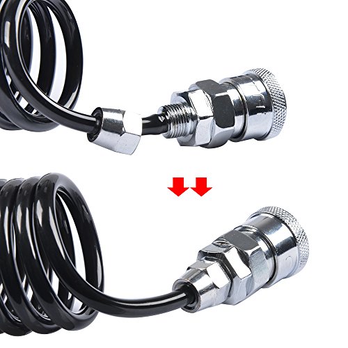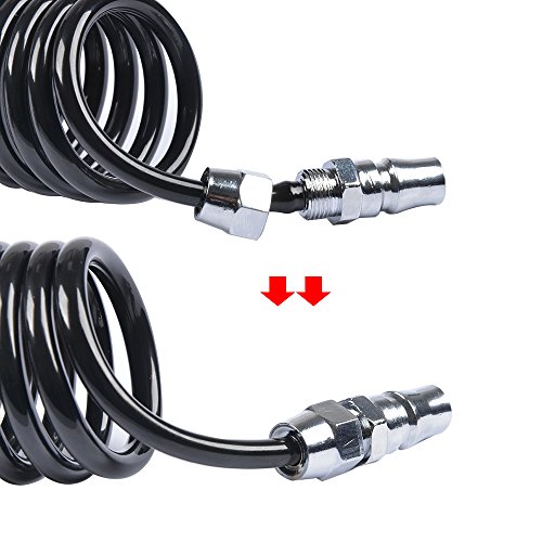 - 伸ばして作業ができ、縮めて収納できる伸縮で邪魔にならないコイル状のエアホース