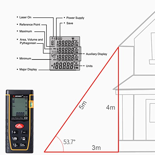 - 使用範囲が広い:当製品は距離や長さ、面積、体積の測定によく使います。また、連続測定やピタゴラス間接測定機能も付きます。使用範囲が広いので、巻尺・メジャーに代わる新しい生活必需品となります