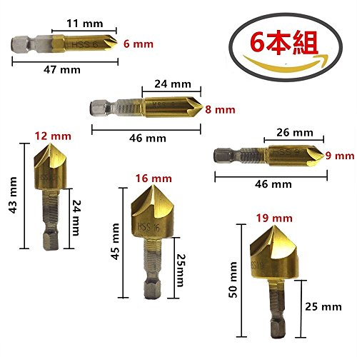 - ▲5枚刃面取り ビット(6本組)製品構成: 6-196mmセット6本 - それぞれ6,8,9,12,16,19mm、体重122グラム。 表面処理:チタン、錆、より美しく、表面の硬度を高めます。