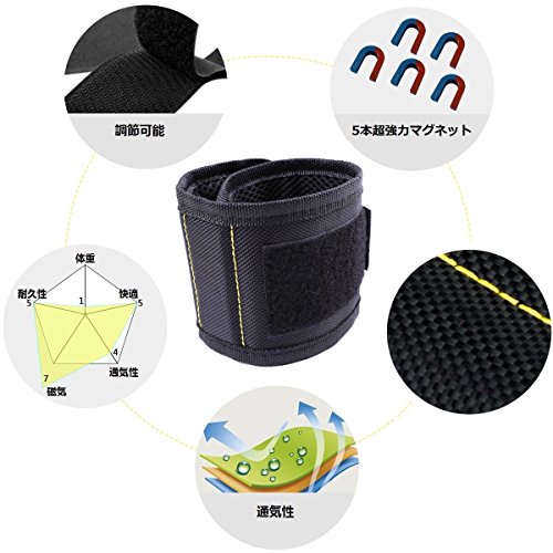 - 【超強吸着力】:固定ベルクロのリストストラップは5つの磁石を含み、強い吸着力を持っています。走っ ても跳んでもネジが落ちない。ネジ、ドライバー、レンチ、ペンチ、ナット、釘などの金属製の物を使いやす くするために使用します。