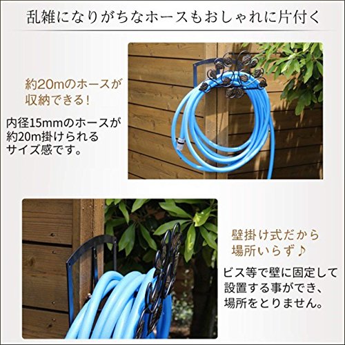 - アンティークな見た目がおしゃれで、ホースをスッキリ収納できる壁掛けホースホルダー。ビスなどで壁に固定して設置することができるので、場所をとりません。※ビスは付属しておりません。内径約15mmホースが約20m掛けられるサイズ感です。