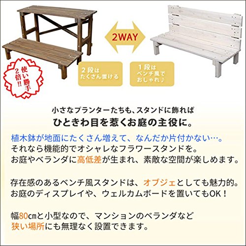 - 天然木のナチュラルな表情が美しいフラワーラック。たくさん増えたプランターの収納にお使い頂けます。幅80cmと小型なので、マンションのベランダなど狭い空間にも無理なく設置できます。さらに2WAYで機能的!簡単組み立て式で、2WAYの使い方ができ使い勝手もお得感も2倍!2段タイプと3段タイプの2種類からお選び頂けます。