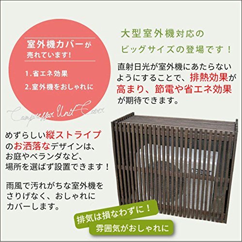 - 人気の天然木製の室外機カバーに大型室外機対応のビッグサイズが登場!日よけや節電対策、雨風をガードする役目を果たします。珍しい縦ストライプデザインで、前面はもちろん、側面・上面も排気効率を損なわない仕様に。雨風で汚れがちな室外機をさりげなく、おしゃれにカバーします。