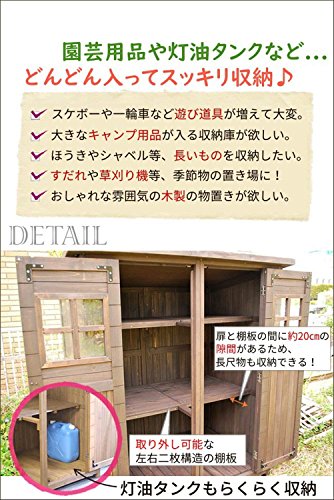 - ガーデニング用品やアウトドアグッズ、灯油タンクなど・・・たくさん収納できる!天然木製の屋外用物置き。スチール製より緑に馴染んでおしゃれ♪置くだけで、雰囲気のあるお洒落なお庭に早変わりします。置き場所に困る季節物、子供の遊び道具なども全部まとめてスッキリ収まります。