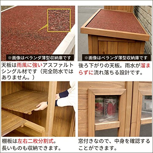 - 棚と棚板の間に約20cmの隙間があり、ほうきやスコップ等の長尺物も収納可能。中の棚板は左右二分割になっており、片方又は両方が取り外し可能で、自由にアレンジできます。天板は雨風に強いアスファルトシングル材で、後ろ下がりの仕様のため、雨水が溜まりにくくなっています。