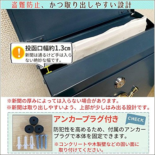 - 投函口幅は約1.3cm、新聞は入るけど手は通らない、絶妙の幅です。※新聞の厚みによっては入らない場合もございます。また、新聞は取り出しやすいよう、上部が少しはみ出る設計です。