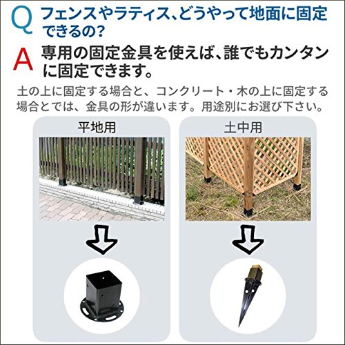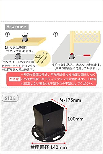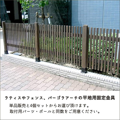 - お庭のフェンスやラティス、パーゴラアーチを地面に固定させるための金具「平地用ウッドポール固定金具」。単品または、4個セットのいずれかをお選び頂けます、ラティスやフェンスの取付用パーツ、ポールと同数をご用意下さい。コンクリートに固定する場合は、必ず市販のアンカーボルトを使用してください。