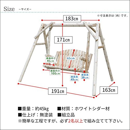- カナダの雄大な自然を実感できる!カナダ製ログファニチャーシリーズより、お庭にあったら子供たちも大喜び!屋外用2人乗りブランコ。北米大陸東北部に自生するホワイトシダー材を使用し、その独自の抗菌作用により、害虫がつきにくく腐りにくいのが特徴です。