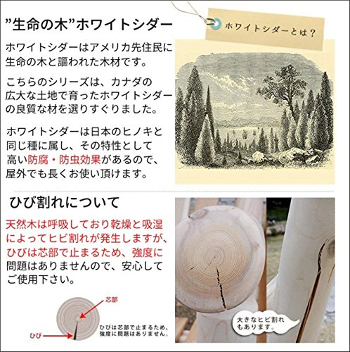 - ※天然木のため、節や、乾燥による割れが発生する場合があります。強度に問題はありませんので、安心してご使用ください。※ホワイトシダーは年月を経ると褪色し、シルバーグレーに変色します。アンティークな趣が人気ですが、なるべく変色を遅らせたい場合は、最初に木材保護塗料を塗ることをおすすめします。