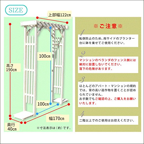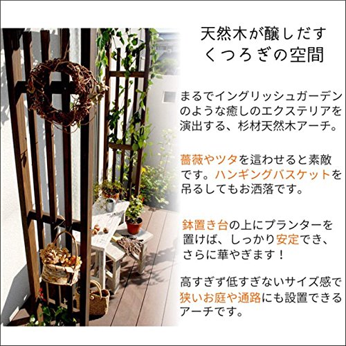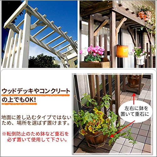 - 玄関のアプローチや出入り口など「くぐる場所」にもピッタリ。地面に差し込むタイプではないので、ウッドデッキやコンクリートの上でも設置可能です。※転倒防止のため、左右にプランターを乗せて、重石のかわりにして使用して下さい。