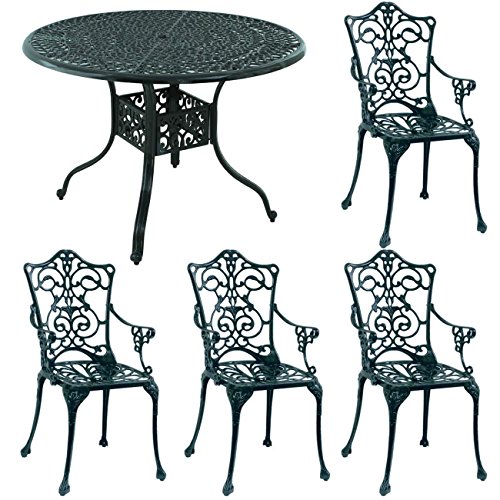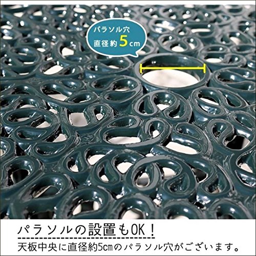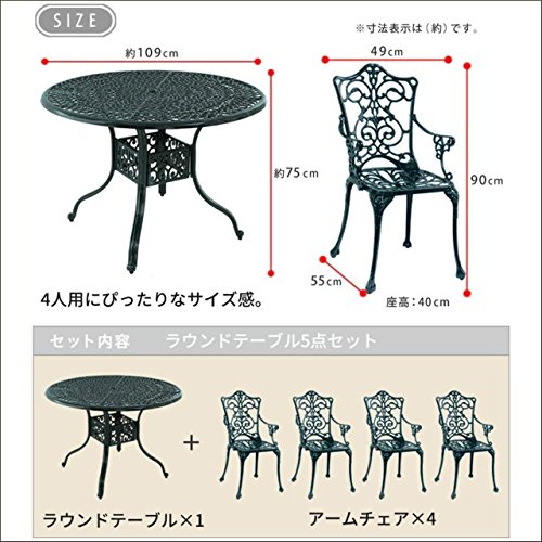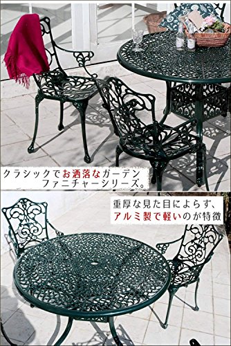 - 【重量】オーバルテーブル:19.2kg、アームチェア:4.5kg(1脚) 【カラー】ダークグリーン 【材質】アルミ鋳物(粉体塗装仕上げ) ※テーブルの天板、中央にはパラソル穴付きです。