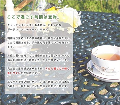 - アンティークテイスト溢れる、おしゃれなガーデンファニチャー・シリーズ。繊細さが薫るツタの装飾模様が魅力的で、置くだけで、お庭が上品なイングリッシュガーデンにクラスアップ!見た目は重厚感がありますが、アルミ製なので軽く、扱いやすいのが特徴。
