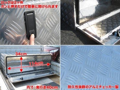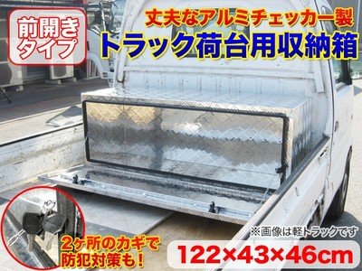 前側に開くので出し入れがしやすく便利です。 【商品詳細】 セット内容:本体、カギ×4 サイズ(約):幅122×奥行き43×高さ46cm 重量:12kg 箱サイズ:124×45×47cm ※1枚目の画像は軽トラックです 生産地:中国 良品返品不可