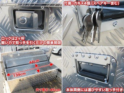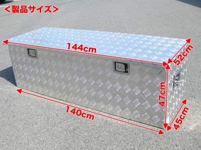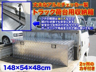 フタは油圧式のため、開けた状態で固定されて指を挟む心配もありません。 【商品詳細】 セット内容:本体、カギ×4 サイズ(約):幅144×奥行き52×高さ47cm 重量:19kg 箱サイズ:148×54×48cm ※1枚目の画像は2tトラックです 生産地:中国 良品返品不可