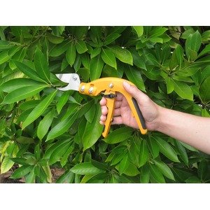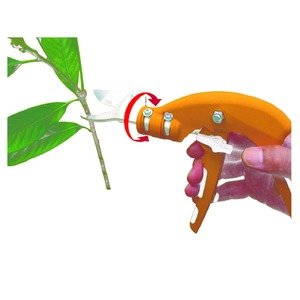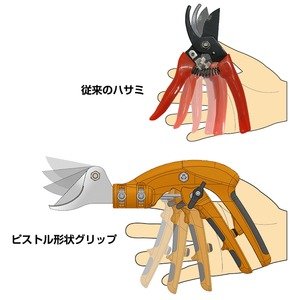 - ・沖縄、離島および一部地域への配送時 ・同梱区分が異なる商品の複数購入時 【出荷目安】:5 - 8営業日 ※土日・祝除く 】:通常商品 手の向きに対し水平な位置に刃があるため、従来のハサミに比べ手首のひねりや姿勢の変化を抑え、連続作業の効率UP! ・ピストル形状グリップ (手首をひねらず自然な握りを維持できる為、連続作業でも疲れにくい形状) ・刃先90度回転 (枝に合わせ刃先の角度を変える事で姿勢を変えずに切断) ・切断径2段階調整ストッパー (ハンドルストッパーの位置によって刃の開きを2段階に調整) 【商品名】 ピストル剪定鋏【園芸】 【サイズ】 全長260mm、刃長53mm 【重量】 約240g 【材質】 剪定鋏(高級刃物鋼+無電解ニッケルメッキ仕上げ、グラスファイバー樹脂、T