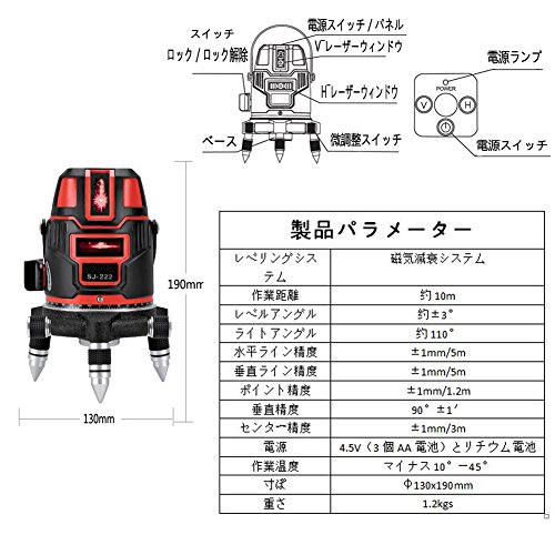 - 2ライン (一本垂線,一本水平線,二個強いレーザースポット) 、 重さ:1.2kg 本体尺寸 190*130 mm
