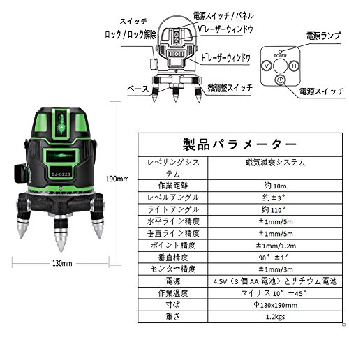 - 3ライン (二本垂線,一本水平線,三個強いレーザースポット,一個ポイント) 、 重さ:1.2kg 本体尺寸 190*130 mm