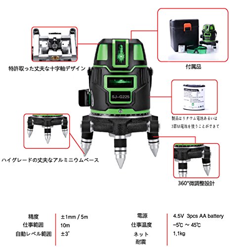SJ 5ライン グリーンレーザー墨出し器 5線6点 回転レーザー線4方向大矩照射モデル【標準セット】