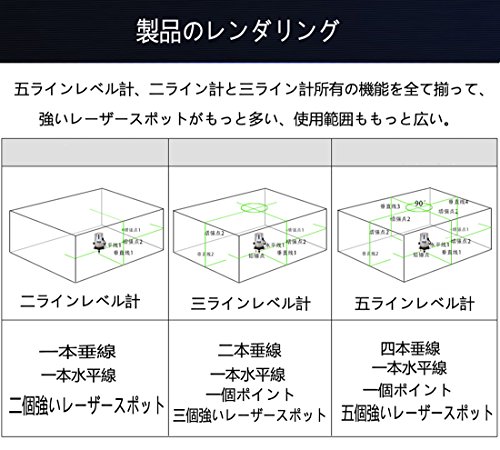 - 5ライン (四本垂線,一本水平線,五個強いレーザースポット,一個ポイント) 、 重さ:1.2kg 本体尺寸 190*130 mm