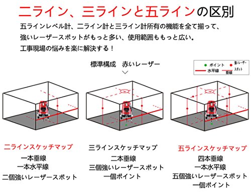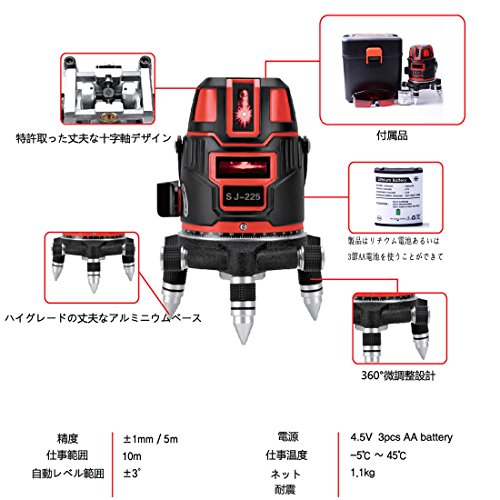 SJ 5赤ライン レーザー墨出し器 4方向大矩ライン 4垂直・1水平 フクダ 墨出し器 自動補正レーザーレベル レーザーライン 地墨ポイント 水平器