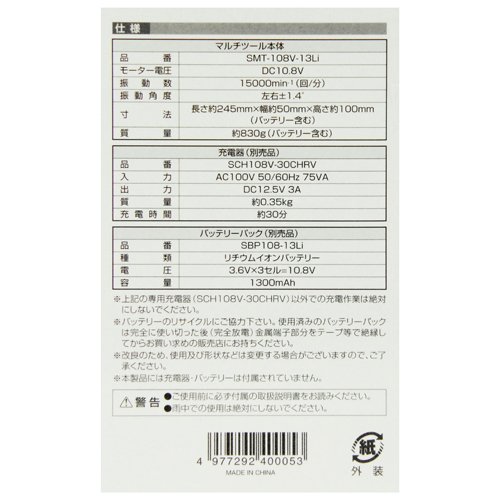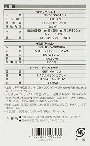 ●【用途】木材・金属・石材類の切断・研磨作業。【機能・特徴】人間工学に基づく操作性、作業性を重視したデザインです。振動角度1.4度、毎分15000回/分の高速振動を利用して木、タイル、レンガ、非鉄金属の切断や研磨などいろんな作業ができます。木・タイル目地・レンガ・石膏ボード・非金属の切断や研磨など、アクセサリーを変えれば一台でいろんな作業ができます。白色LED作業ライト機能付きです。●サイズ(バッテリー含む):長さ約245×幅約50×高さ約100mm。●質量:約830g(バッテリー含む)。【注意事項】ご使用前に取扱説明書を必ずお読みください。本製品には充電器、バッテリーは付属されていません。充電器SCH108V-30CHRV以外での充電作業は絶対にしないでください。雨中での使用は絶対にしないでください。