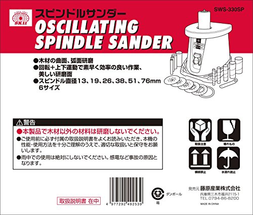 ●【商品説明】●「SK11 スピンドルサンダー SWS-330SP 330W」は、木材の曲面研磨が楽々行えます。●ドラム状のペーパーを上下+回転させて木材の曲面をきれいに、早く研磨できます。●糸鋸、バンドソーの切断後の曲面研磨や、穴あけ作業後の仕上げの研磨に最適です。●必要なアクセサリー類はすべて本体周りにスッキリ収納できます。●木工作業には欠かせないサンダーです。●木材専用です。●【お問い合わせ先】●藤原産業 株式会社0794-86-8200●【製品仕様】●電源:100V●電流:3.9A●消費電力:330W●スピンドル上下動ストローク数:50(回/分)●スピンドル上下動ストローク幅:16mm●コード長2.0m●本体質量:13kg●【ご注意】●使用中は、軍手など巻き込まれる恐れがある手袋を着用して使用しないでください。●使用中は、工具類や回転部、切りくずなどに手や顔を近づけないでください。●作業中は材料を両手でしっかりと保持し、回転部へ材料を強く押し当てすぎないようにしてください。●作業が終了しましたら、必ずスイッチをOFFにし、電源プラグをコ...