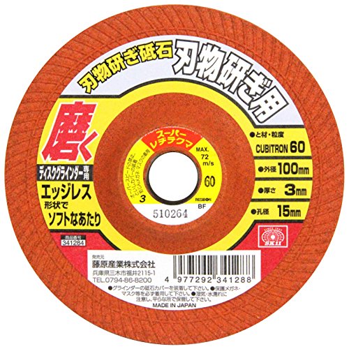 ●【用途】刈払刃(黒刃)の刃研ぎに。使用機種/ディスクグラインダー100mm。研磨専用低速グラインダー100mm。【特徴・機能】アタリの細かいエッジレス形状で深く研削しすぎないため使いやすい。●ディスクグラインダー専用。【材質】結合剤:BF。【注意事項】チップソーの超硬研磨にはダイヤモンドタイプをご使用ください。保護メガネ・マスクなど安全保護具を着用して正しく安全にご使用下さい。オーバースピードや側面使用はしないでください。 砥石に、カケ、歪み、ヒビ、ワレ、水ぬれ、油ぬれなどの使用上有害な欠陥がないことを確認してください。