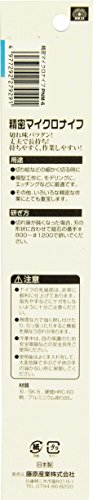 ●【用途】モデリングやジオラマなど細かな作業。●【機能・特徴】硬度HRC60度まで焼入れしているので切れ味が長く持続します。●超精密な作業に最適です。●シャープな切れ味と耐久性があります。●用途に応じて刃先形状を選べます。●【材質】刃:SK-5。●柄:アルミニウム削り出し。【注意事項】ナイフの先端部は、非常に鋭利に仕上げてあります。指先や手などにケガをしないように十分に注意してください。切れ味が鈍くなった場合、刃の形状に合わせて砥石の番手800~1200番で研いでください。