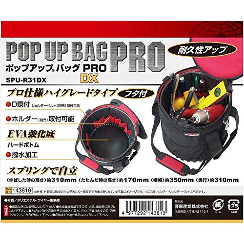 ●【用途】工具・道具・資材の収納持ち運びに。【機能・特徴】耐久性がアップしたプロ仕様ハイグレードタイプです。安心のフタ付です。D環付なのでショルダーベルト(別売)取付可能です。ホルダー(別売)取付可能です。スプリングで自立します。【注意事項】合成繊維製品ですので、火気、薬品等に近づけないで下さい。